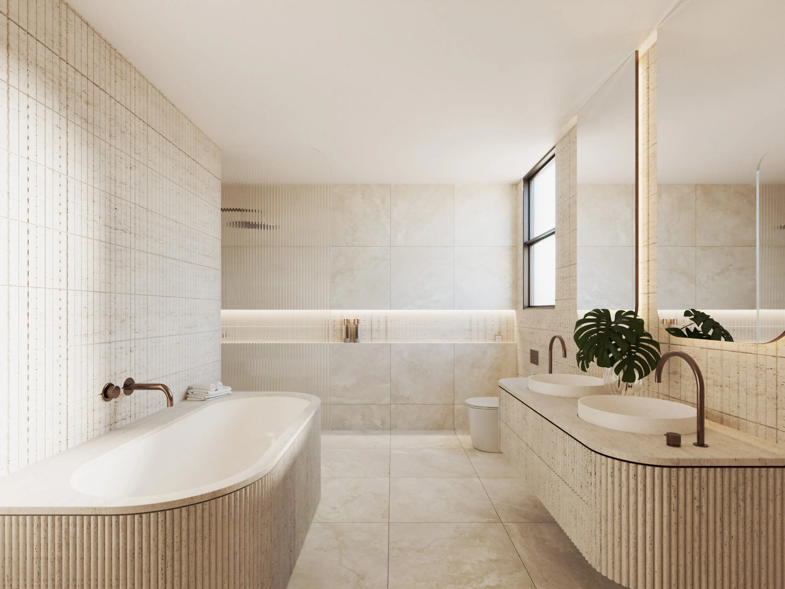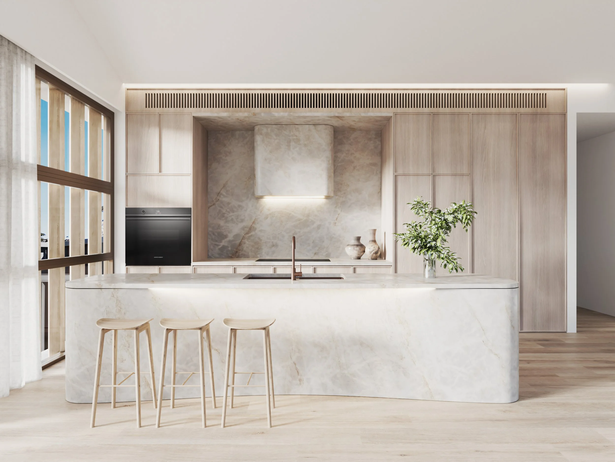 Light and fluid in form, the architecture echoes the movement of ocean waves and the natural contours of the coastline. A robust yet refined palette, enhanced with reflective surfaces, creates a radiant presence. Designed to embrace coastal luxury, residences open to sweeping views through expansive terraces and full-height glazing, dissolving boundaries between home and horizon while flooding interiors with natural light.
